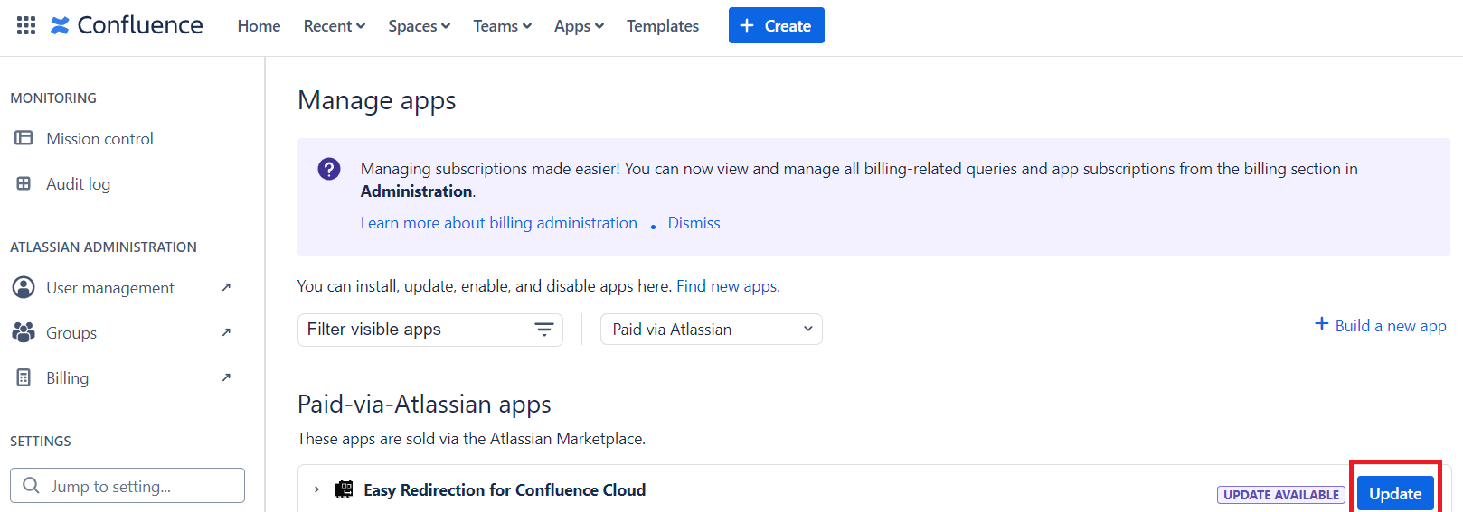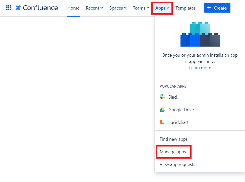In your Confluence instance, navigate to Apps > Manage Apps: