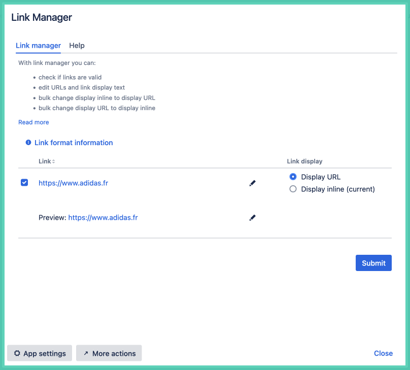 With one click all selected links can be set to change to ‘display URL’ or ‘display inline’.
