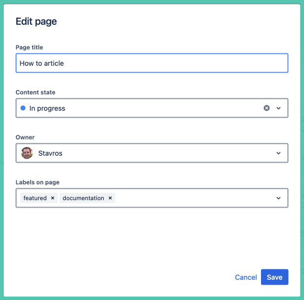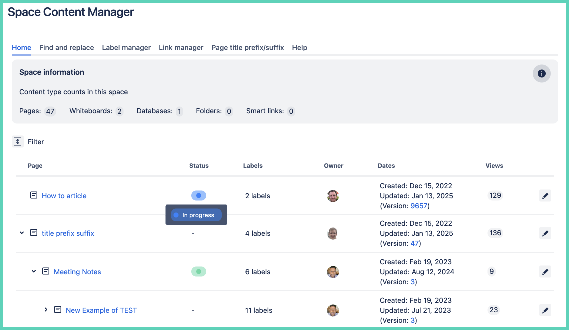 Edit title, status, owner, labels or see metadata under Overview (formally Home) which is the default tab.