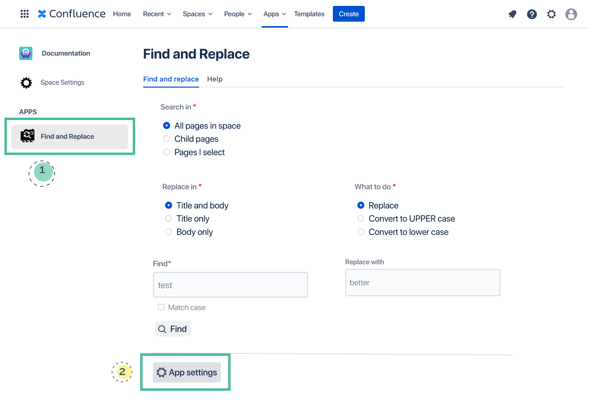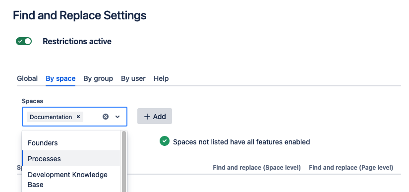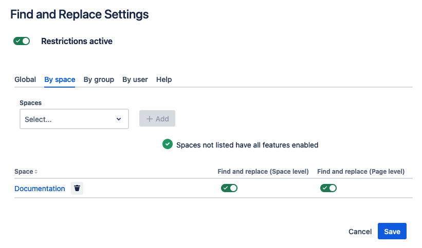 In the example below space level Find and Replace is disabled for all users in the ‘Documentation’ space.