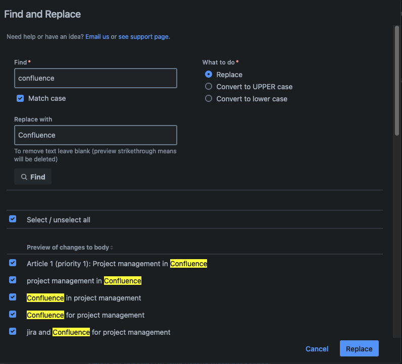 Using find and replace the compliance team searched for the outdated terms across the space.